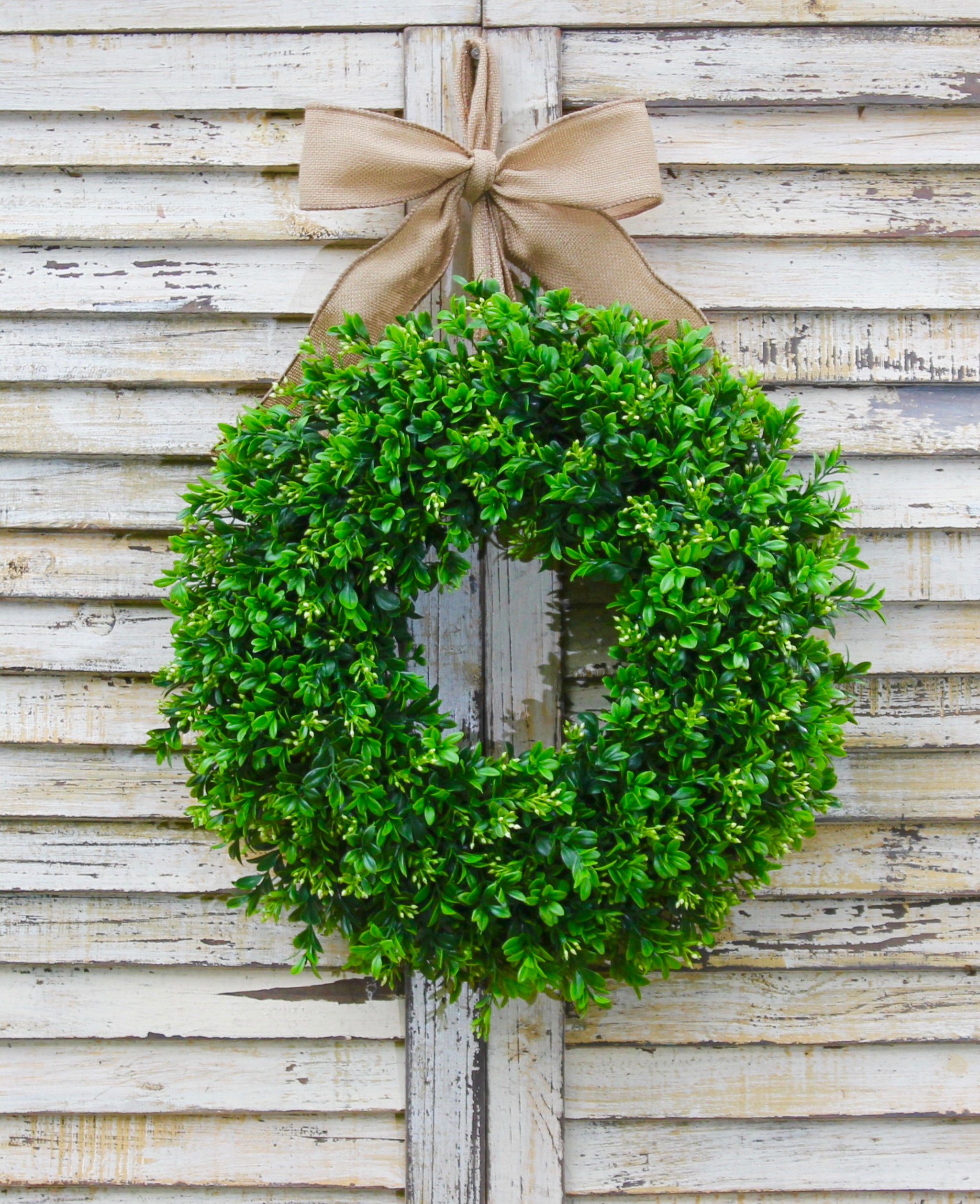 This beautiful artificial boxwood will last through the seasons - perfect to go with farmhouse decor. Choose your bow color to make this wreath uniquely yours.